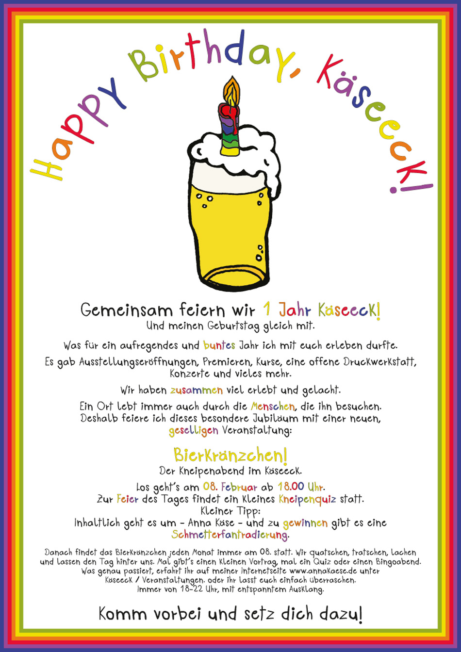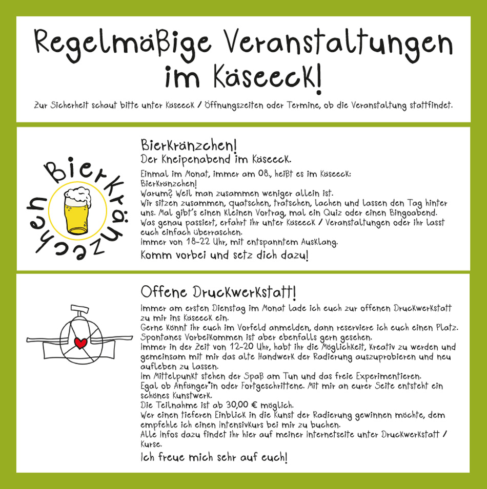 Happy Birthday, Käseeck!8. Januar 2026Neu! Regelmäßige Veranstaltungen im Käseeck!5. Januar 2026Farben einer Kämpferin! Weihnachtsausstellung im Käseeck.4. November 2025