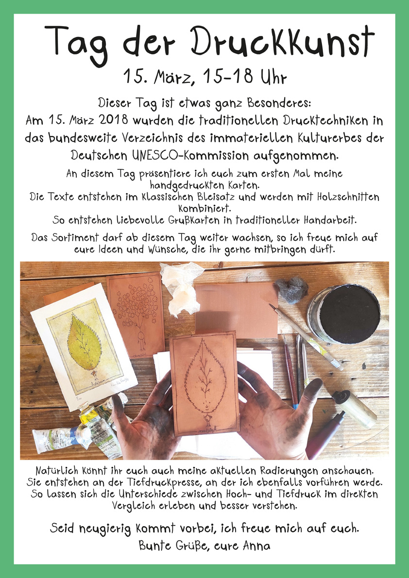 Kaufladen Neuigkeiten Termine Was bisher geschah Mein Newsletter Kontakt Kunst direkt zum Mitnehmen Öffnungszeiten Veranstaltungen Druckwertkstatt Kurse Öffnungszeiten Druckwerkstatt Kurse Öffnungszeiten Was bisher geschah Galerie Neuigkeiten Termine Kontakt Newsletter Radierungen Unikate Schnick-Schnack Versandkosten/AGB
