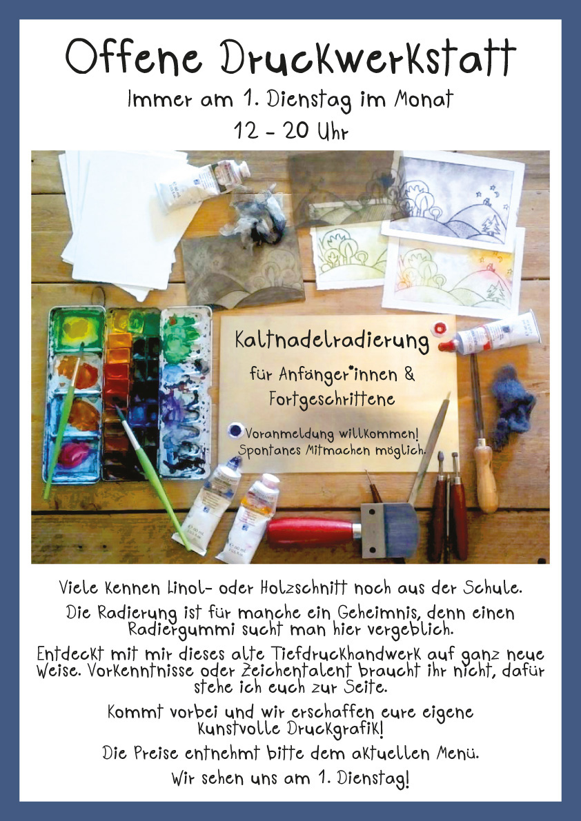 Kaufladen Neuigkeiten Termine Was bisher geschah Mein Newsletter Kontakt Kunst direkt zum Mitnehmen Öffnungszeiten Veranstaltungen Druckwertkstatt Kurse Öffnungszeiten Druckwerkstatt Kurse Öffnungszeiten Was bisher geschah Galerie Neuigkeiten Termine Kontakt Newsletter Radierungen Unikate Schnick-Schnack Versandkosten/AGB